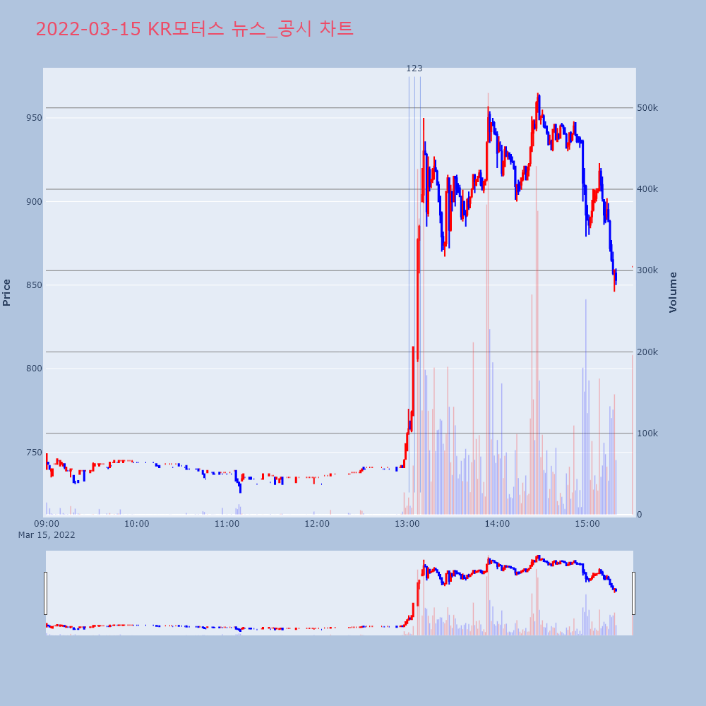 | 2 | KR모터스, +8.13% VI 발동KR모터스(000040)가 VI가 발동했다. 전일 대비 | 조선경제 | KR모터스 | 2022-03-15 13:04:59 |