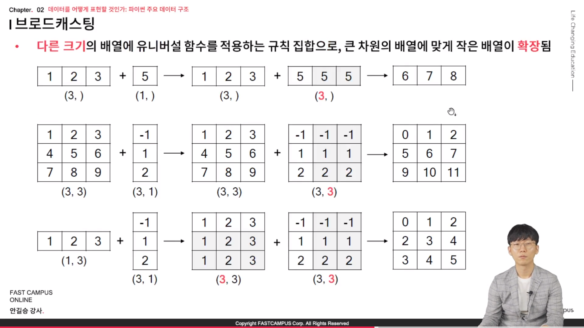 - 다른 크기의 배열에 유니버셜 함수를 적용하는 규칙 집합으로, 큰 차원의 배열에 맞게 작은 배열이 확장됨.