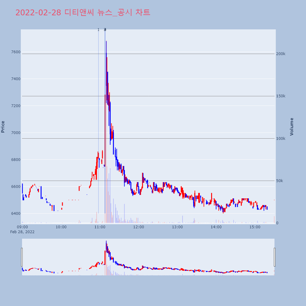 | 4 | 디티앤씨, +13.54% VI 발동디티앤씨(187220)가 VI가 발동했다. 전일 대비 | 조선경제 | 디티앤씨 | 2022-02-28 11:08:11 |