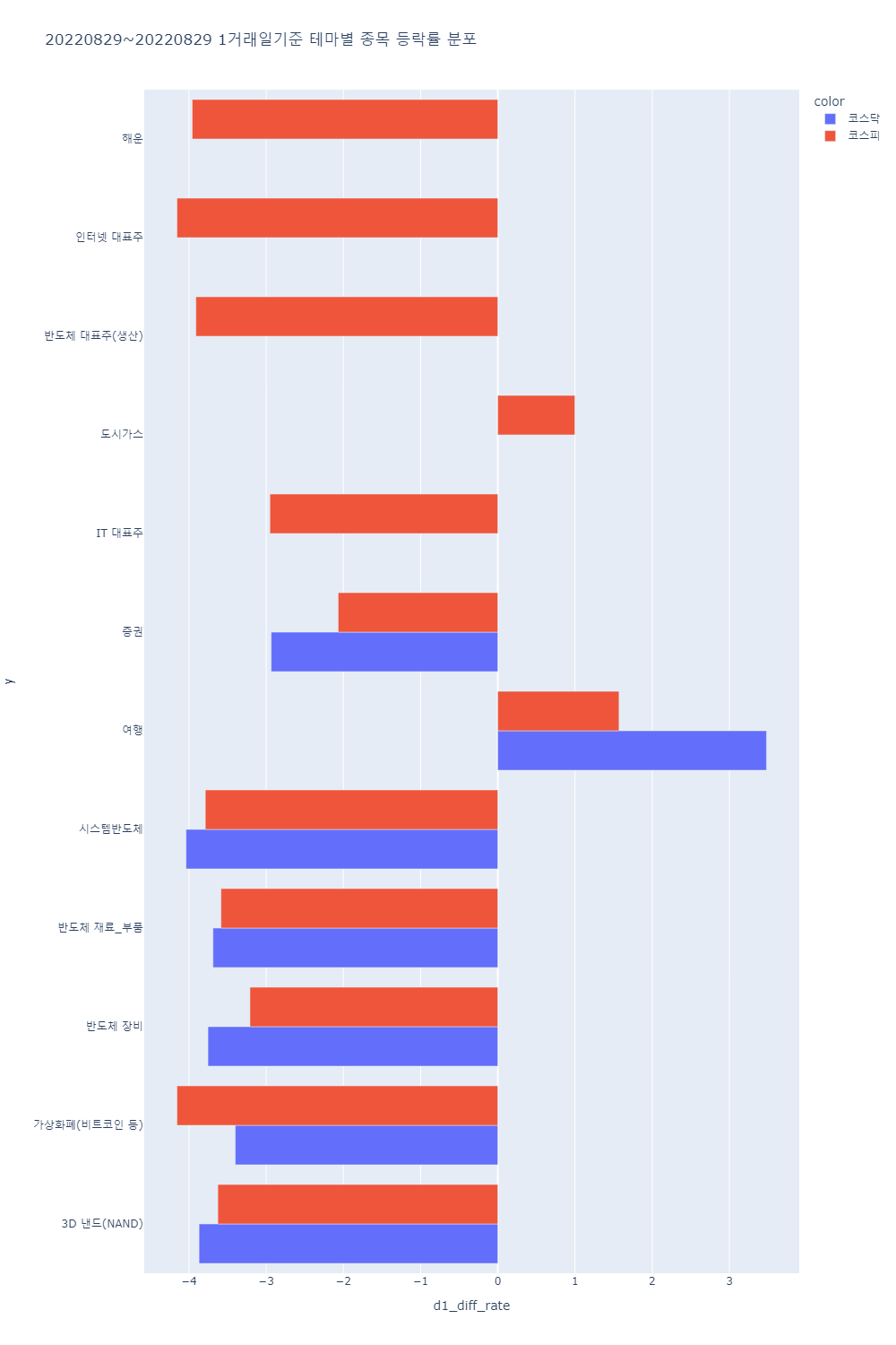 | ▷정부가 입국 전 코로나19 검사 폐지를 검토하고 있는 가운데, 감염병자문위의 입국 전 코로나19 검사 폐지 권고 소식 등에 여행 테마 상승. ▷유럽, 미국 천연가스 가격 고공 행진 속 산업부-기재부, 10월 도시가스 요금 인상 수위 논의 소식 등에 일부 도시가스 테마 상승. ▷반면, 파월 Fed 의장 매파적 발언 등에 따른 美 기술주 급락 등에 반도체, 인터넷, IT 대표주, 2차전지 등 기술/성장 테마 일제히 하락. 증시 급락 등에 증권 테마도 하락. ▷글로벌 컨테이너 해운 운임 하락세 지속 등에 해운 테마 하락. ▷비트코인 2만달러선 붕괴 소식 등에 가상화폐(비트코인 등), 두나무 관련주 하락. ▷국내 코로나19 신규 확진자 감소세 속 코로나19(진단키트), 코로나19(치료제/백신 개발 등) 등 코로나19 관련 테마 하락. 재택근무/스마트워크, U-Healthcare(원격진료) 테마 등도 하락. ▷K2전차·K9자주포 폴란드 수출 본계약 체결 소식에도 차익실현 매물 출회 등에 방위산업/전쟁 및 테러 테마 하락. ▷이 외 증시 급락 속 면역항암제, 웹툰, LED장비, 음원/음반, 스마트카, 영상콘텐츠, 희귀금속(희토류 등), 일자리(취업), 육계, 지능형로봇/인공지능(AI), mRNA, 치아 치료(임플란트 등), 아이폰, 마켓컬리 관련주, 광고, 화폐/금융자동화기기(디지털화폐 등) 등의 테마가 하락률 상위를 기록하는 등 대부분 테마가 하락. |