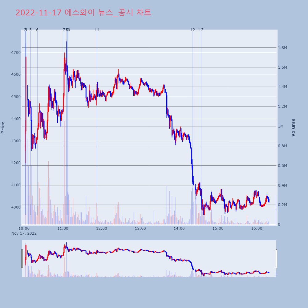 | 13 | [52주 최고가] 에스와이, 전일비 18.6%↑...현재가 4335원[버핏연구소=이상협 기자] 17일 오후 2시 국내 주식 | 버핏연구소 | 에스와이 | 2022-11-17 14:33:59 |