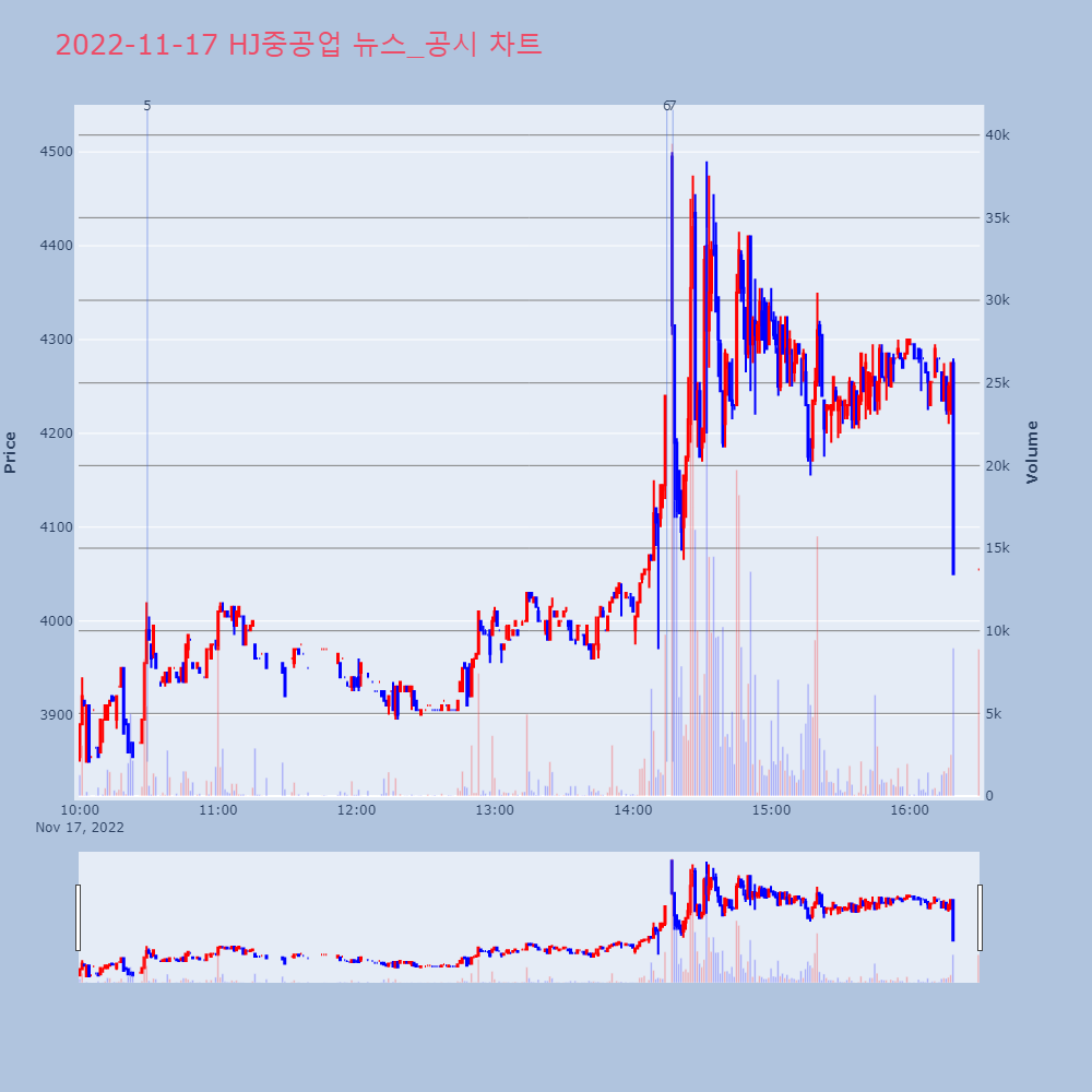 | 6 | HJ중공업, +11.14% VI 발동HJ중공업이 VI가 발동했다. 전일 대비 11.14% | 조선경제 | HJ중공업 | 2022-11-17 14:14:44 |