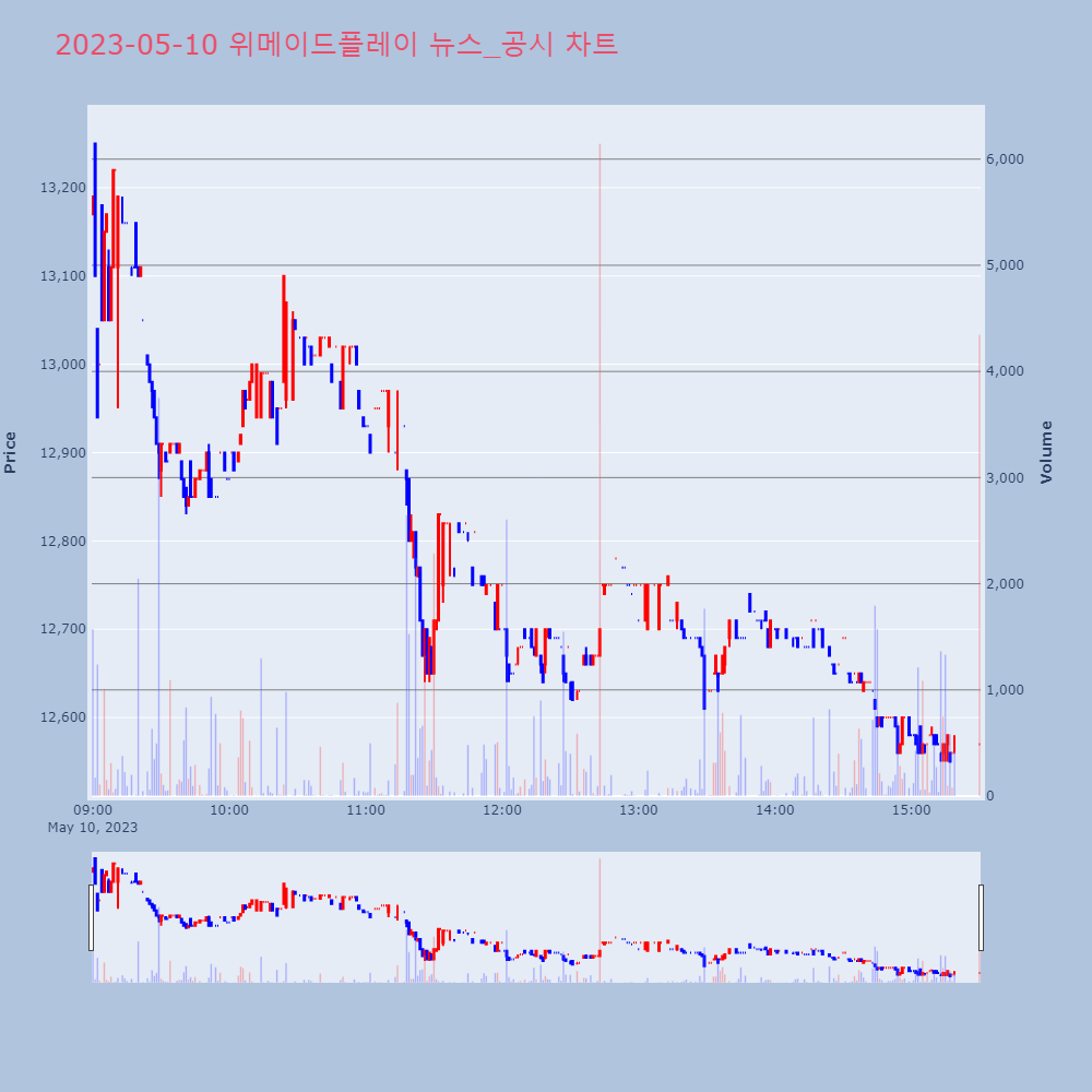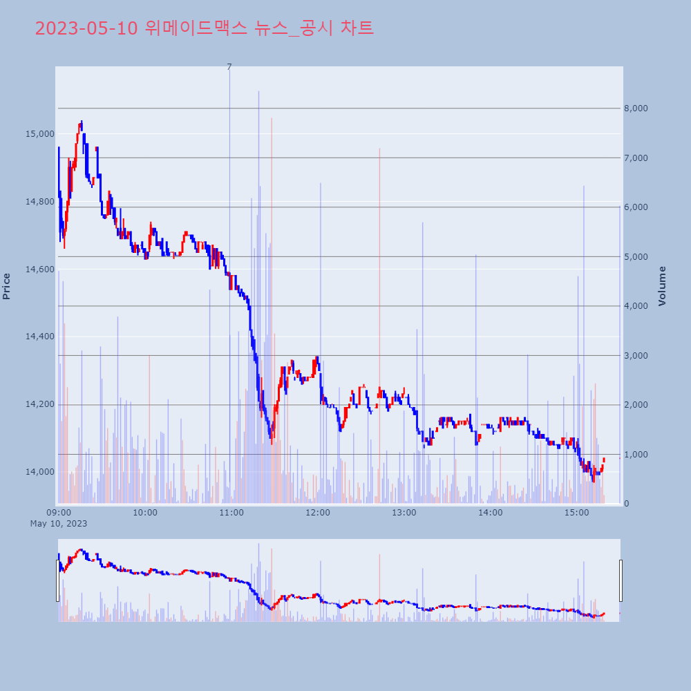 | 4 | 위메이드, +8.63% VI 발동위메이드가 VI가 발동했다. 전일 대비 8.63% 상승 | 조선경제 | 위메이드 | 2023-05-09 13:04:49 |