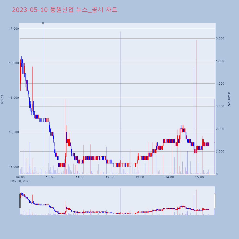 | 8 | [특징주] 동원산업, 1분기 영업이익 전년 동기 대비 18% 감소에 내림세[이투데이/박민규 기자(pmk8989@etoday.co | 이투데이 | 동원산업 | 2023-05-10 09:45:42 |